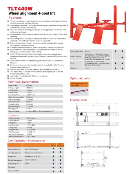 The Launch TLT440W is a premium four-post alignment lift designed to handle comprehensive vehicle servicing needs with precision and strength. With a 4000KG lifting capacity, it accommodates most vehicles on the road today and is fully compatible with advanced 3D wheel alignment systems. This lift is perfect for service centers looking to perform high-accuracy wheel alignment and vehicle maintenance for a wide range of vehicle sizes. The two-layer concealed plate structure provides excellent synchronizing performance with horizontal precision of 1mm, ensuring accurate and reliable lifts for precise alignment work.