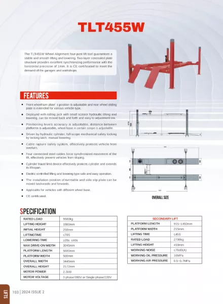 The Launch TLT455W is a top-tier four-post alignment lift, perfect for full-service workshops, tyre shops, and high-end alignment centers. With a substantial 5500kg lifting capacity, it handles small to extra-large passenger vehicles and light commercial vehicles with ease. Designed for precise alignment work, the TLT455W is compatible with Launch 3D wheel aligners and includes features that enhance stability and safety during operation.